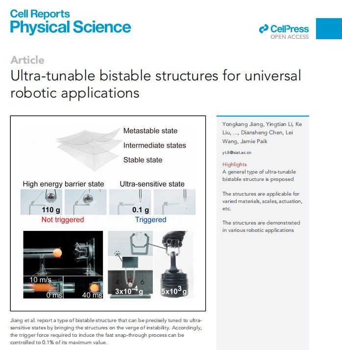 这项科技成就是由中科院联合北京大学、北京航空航天大学、新加坡国立大学以及瑞士洛桑联邦理工学院等几所顶尖高校共同实现的,并发表在《Cell Reports Physical Science》(细胞报告物理科学)期刊中,标题为“Ultra-tunable bistable structures for universal robotic applications”,文章的第一作者为中科院的蒋永康博士。