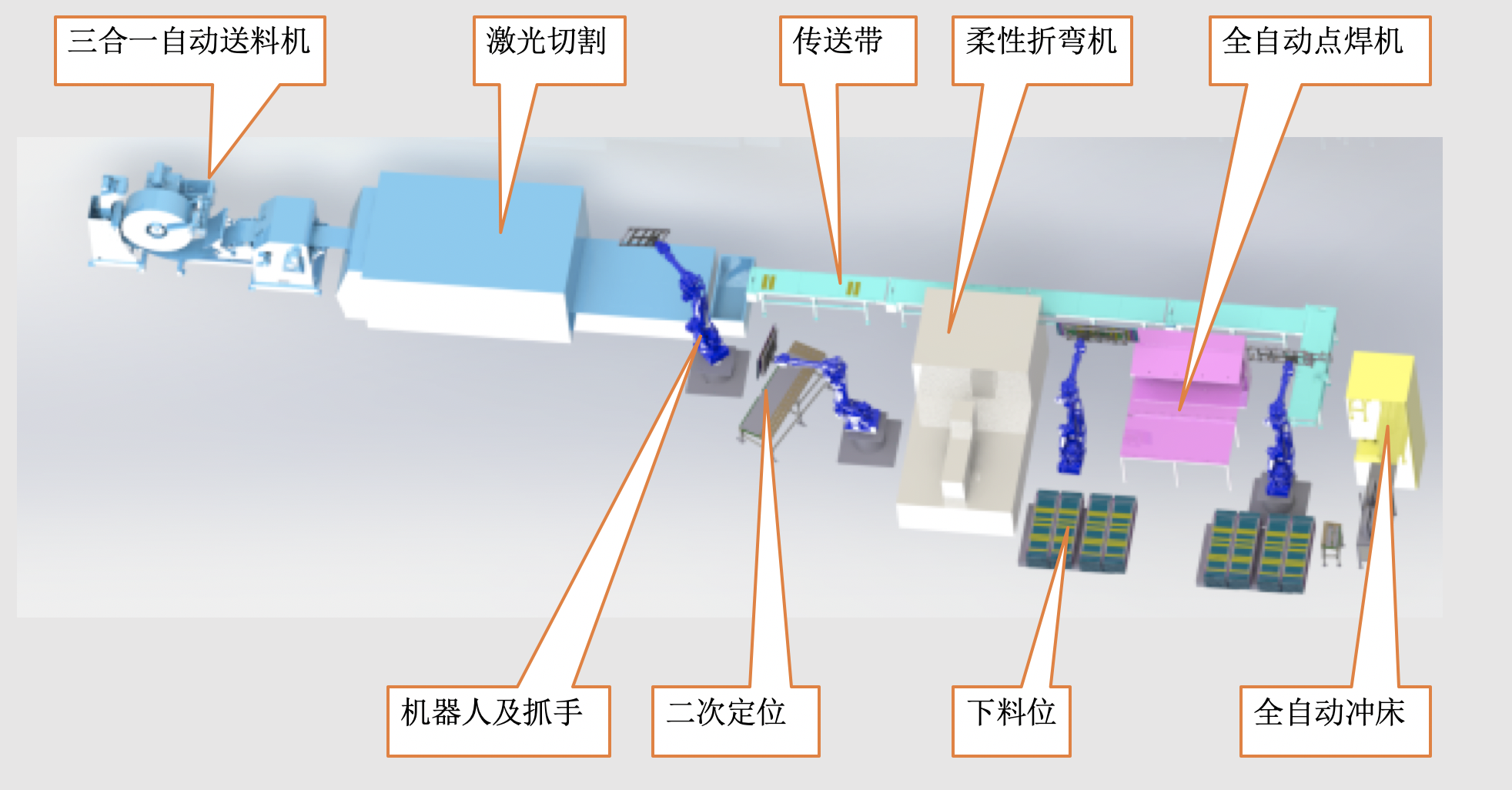 本项目的全自动钣金生产线的设备主要包括:三合一自动送料机、激光切割机、4台机器人、重力对中台、传送带、柔性折弯机、全自动点焊机及全自动冲床等。具体设备如图1-2所示: