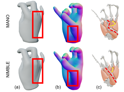 (b)(c) MANO 在形变时没有考虑内部结构,因此用简单的方法为它加上内部结构后会出现奇怪的肌肉和骨骼形变以及不真实的皮肤凹陷,而 NIMBLE 保持了解剖学上正确的和物理上合理的变形。