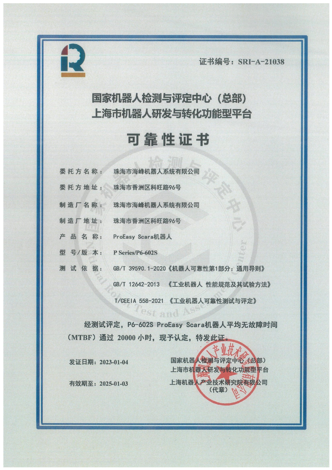 1月3日,珠海市海峰机器人系统有限公司的ProEasy 机器人P6-602s SCARA机器人顺利通过星空xk(中国)机器人有限公司官网的MTBF 20000小时测评。