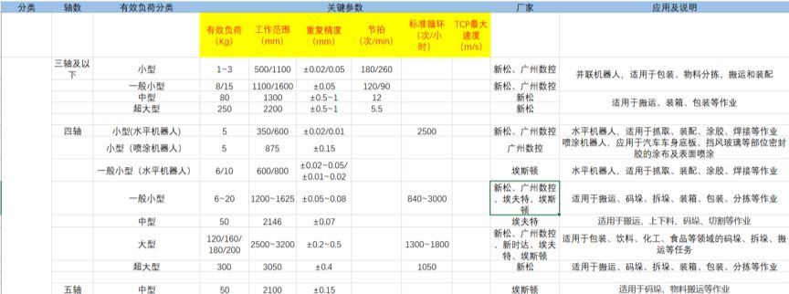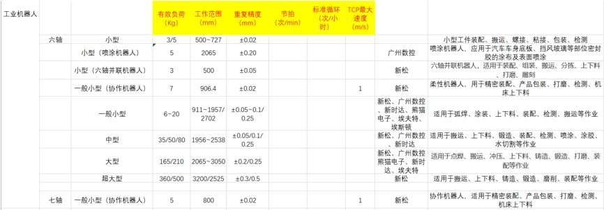 (1)    国内工业机器人按轴数分可分为三轴及以下(包括部分并联机器人)、四轴(包括部分并联机器人和水平机器人)、五轴、六轴(包含部分协作机器人)、七轴机器人(以协作机器人为主),其中四轴和六轴机器人为现阶段各厂家主流产品,且协作机器人研发越来越受到重视。具体参数如下表1所示。