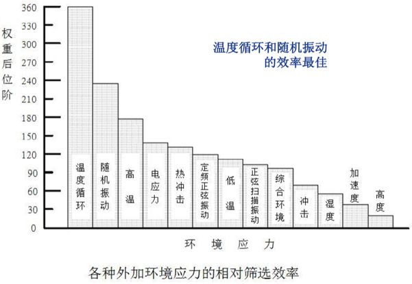 典型的应力筛选类型包括温度循环、随机振动、高温、电应力、热冲击、正弦定频振动、正弦扫描振动、低温、综合环境、湿度、加速度、高度等。根据美国环境科学学会的研究,其中以温度循环和随机振动的效率更佳。